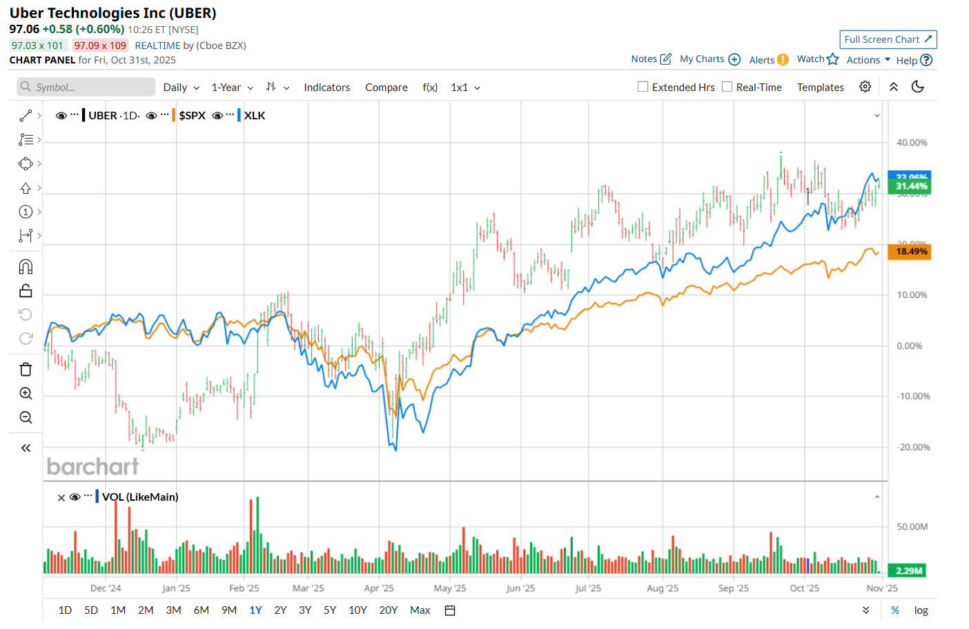 Moreover, zooming in further, UBER has also outperformed the Technology Select Sector SPDR Fund’s (XLK) 29.9% uptick on a YTD basis. However, it has lagged behind XLK’s 31.5% surge over the past 52 weeks.