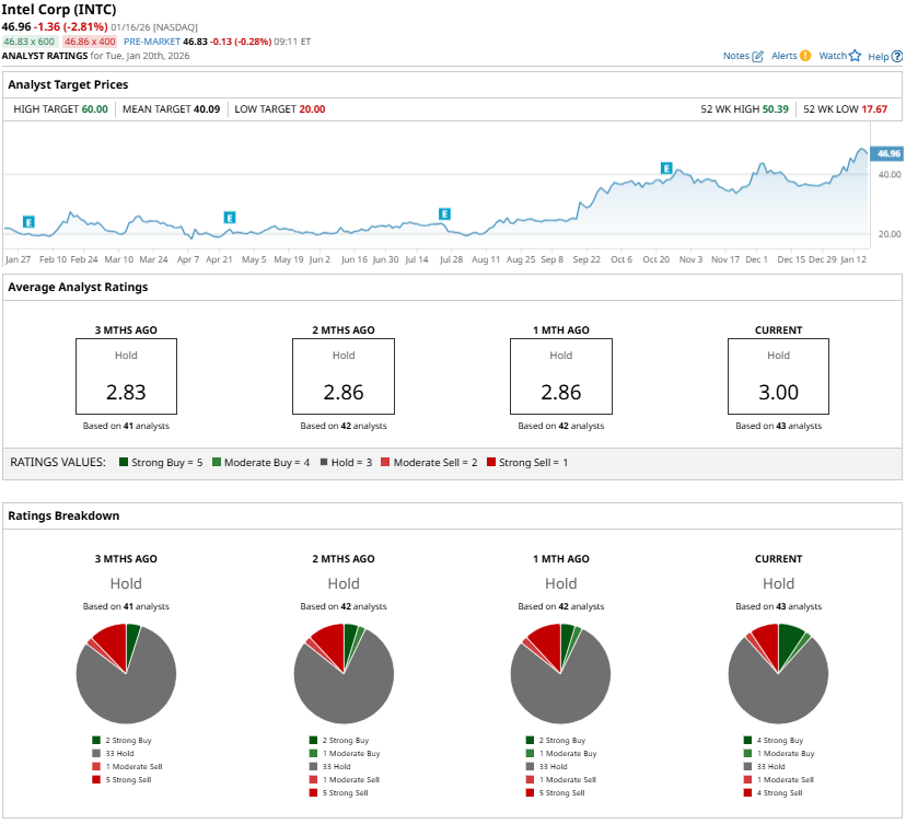That said, competition from rivals remains intense and continues to cap near-term upside. Wall Street analysts currently maintain a “Hold” consensus rating on INTC shares ahead of the fourth-quarter earnings release.