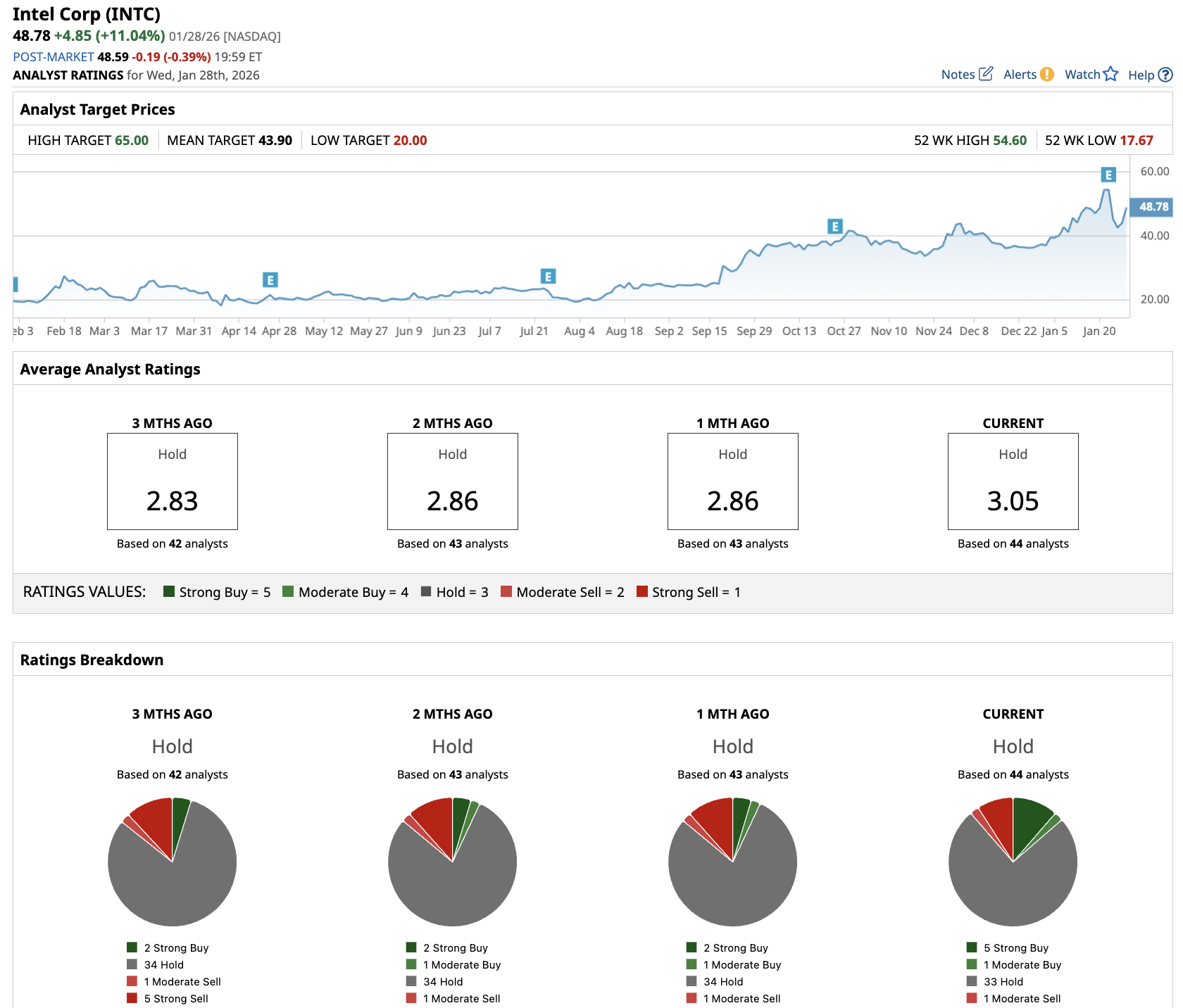 The average INTC stock price target is $43.90, below the current price of $49.
