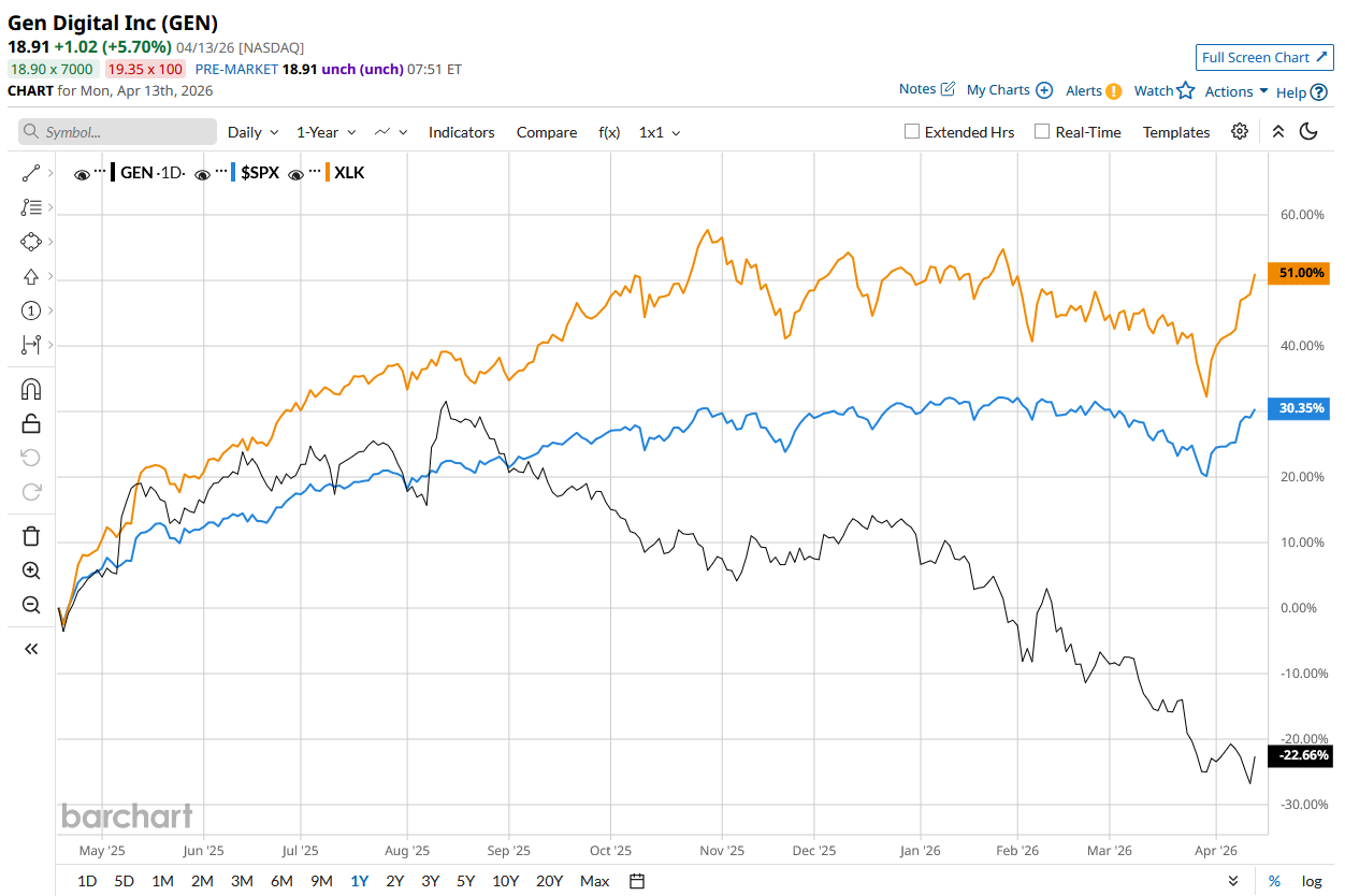 GEN stock has declined 22.5% over the past 52 weeks, underperforming the S&P 500 Index’s ($SPX) 28.4% rise, and the State Street Technology Select Sector SPDR ETF’s (XLK) 46.8% return during the same time frame.