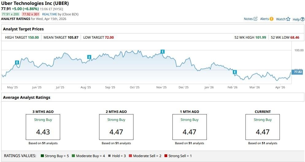 Uber Technologies (UBER) is inching higher on April 15 after announcing a landmark $10 billion commitment to its robotaxi strategy, headlined by an expanded deal with Lucid Group (LCID).
