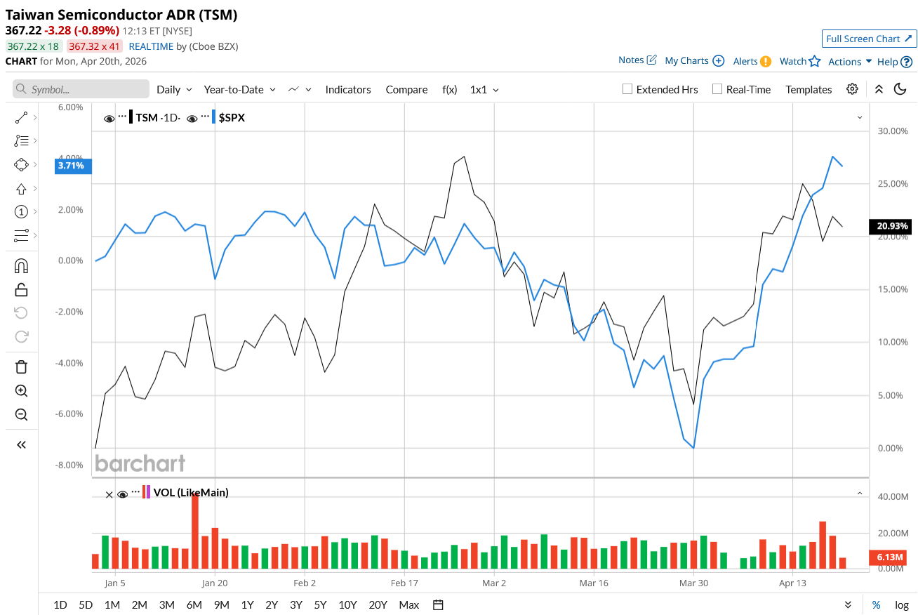 In a market still grappling with macro uncertainty, Taiwan Semiconductor Manufacturing Company's (TSM) Q1 report indicated that the company is strong enough to outweigh cyclical weakness elsewhere. TSMC delivered a powerful start to 2026, reminding investors why it sits at the heart of the global semiconductor ecosystem. TSM stock is up roughly 21% year-to-date (YTD) and 142% over the past 52 weeks, outperforming the broader market gain of 4% YTD.