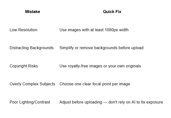 If your generated video looks off, the fix is almost always in the source image, not the prompt. Go back to steps 2–4 above before regenerating.