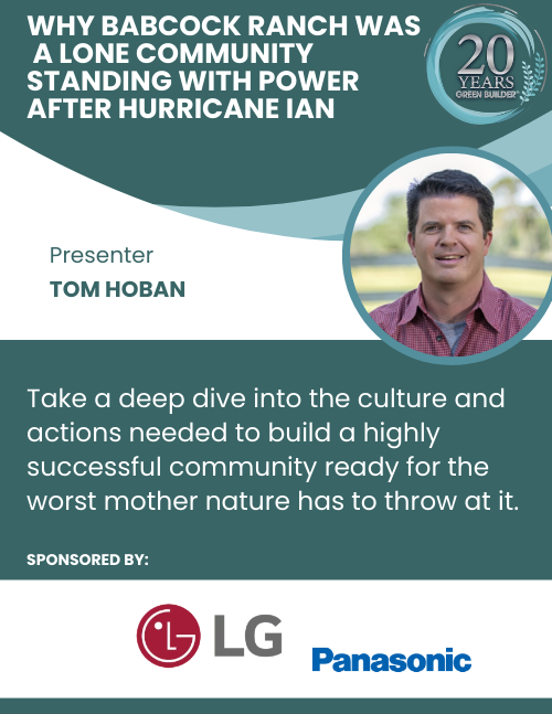Lake City, Colo., Feb. 11, 2025 (GLOBE NEWSWIRE) -- Green Builder Media is pleased to announce a webinar conversation with Tom Hoban, President and Chief Investment Officer, Babcock Ranch, on Thursday, February 13, at 12:00 EST.