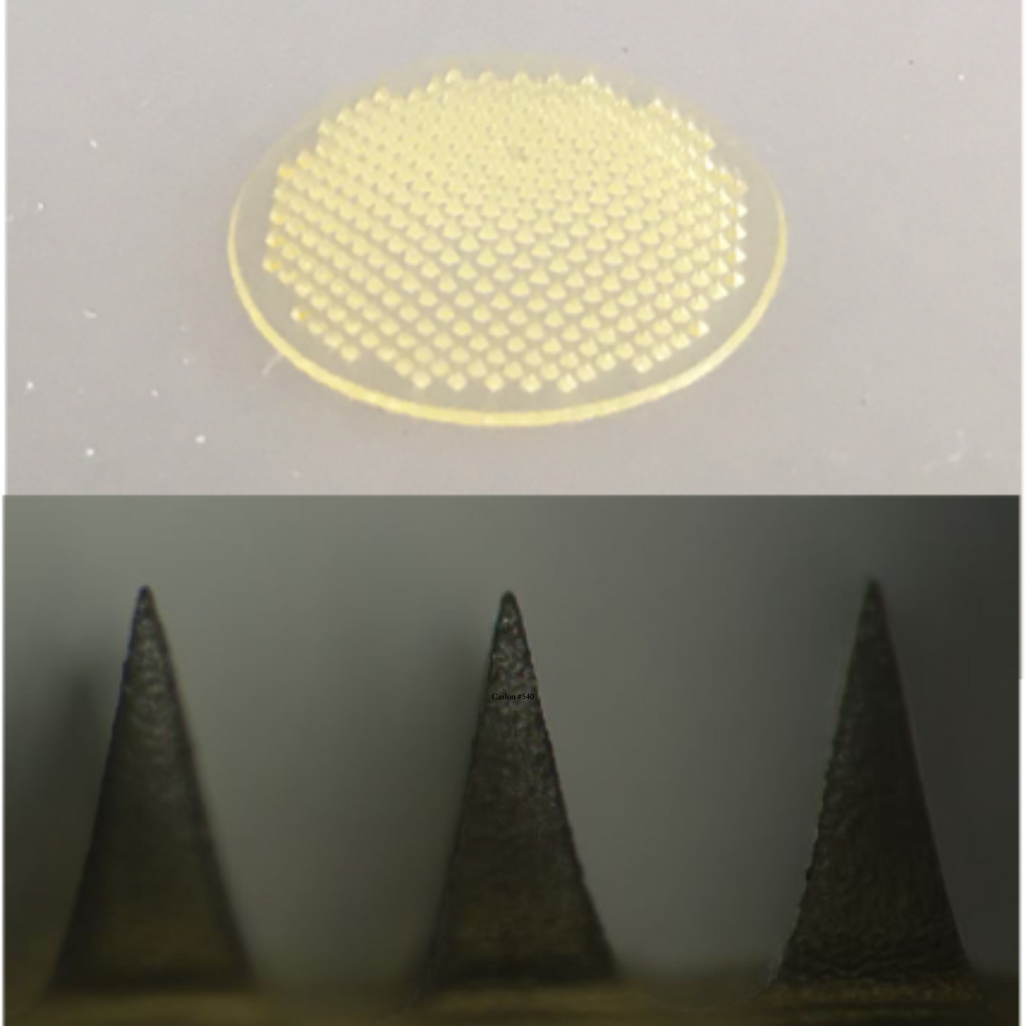 Figure 1. Representative image of PharmaTher's PharmaPatch™ ketamine microneedle patch and close-up of the microneedle array.