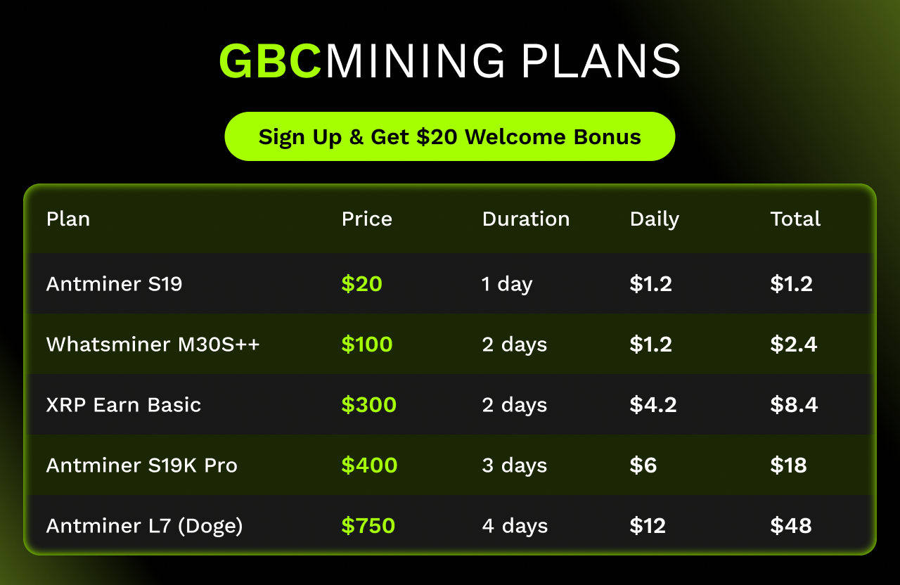 Your crypto wealth journey starts today. Visit gbcmining.com, claim your $20 welcome bonus, and activate your first mining contract. Watch your Bitcoin earnings grow while you focus on what matters.