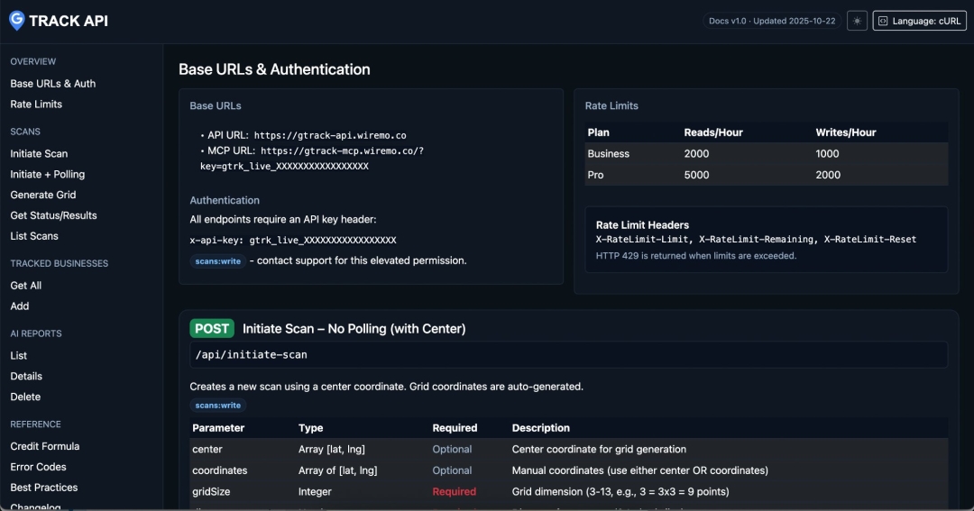 Wiremo announces API access for GTrack Local Rank Checker, enabling Business and Pro plan customers to programmatically access Google Maps ranking data, automate workflows, and build custom integrations. The API includes REST endpoints and MCP integration for AI tools, with enterprise-grade security features. Read access included, write access available as paid add-on.