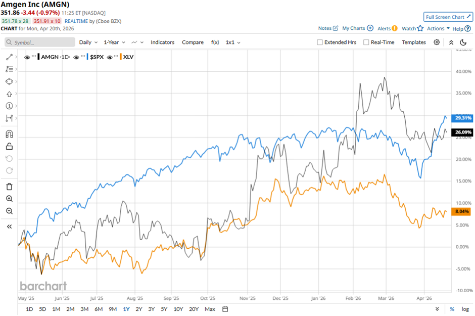 AMGN stock has increased 27.1% over the past 52 weeks, lagging behind the S&P 500 Index's ($SPX) 34.6% gain. Nevertheless, the stock has outperformed the State Street Health Care Select Sector SPDR ETF's (XLV) 9.5% rise over the same period.