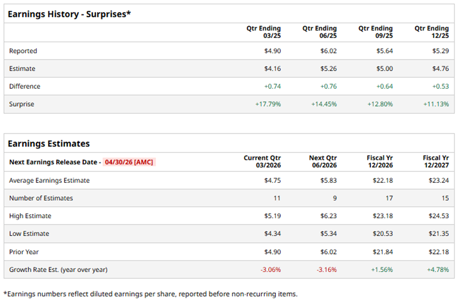 The Thousand Oaks, California-based company is expected to release its fiscal Q1 2026 results after the market closes on Thursday, Apr. 30. Ahead of this event, analysts expect AMGN to report an adjusted EPS of $4.75, down 3.1% from $4.90 in the prior year's quarter. However, it has surpassed Wall Street's bottom-line estimates in the past four quarters.