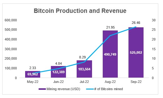 The Company mined 26.46 Bitcoins and achieved a revenue of US$525,002 in September, 2022, representing an increase of 21% and 7%, respectively, compared to the previous month.